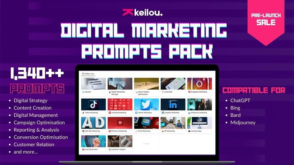 Gain exclusive access to an extensive collection of over 1,340 high-quality Digital Marketing Prompts, optimized for use on AI platforms like ChatGPT, Bing, Bard, and Midjourney. This is the game-changer your digital marketing strategy needs.